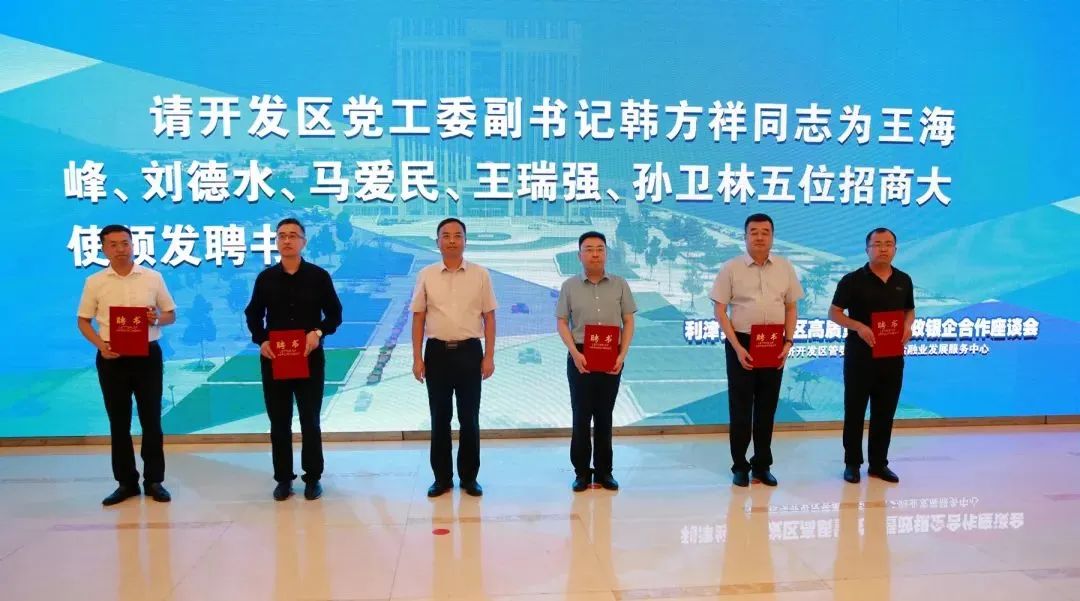 8月4日,诚城联合集团董事长刘德水受邀参加利津经济开发区高质量发展暨政银企合作座谈会,与参会领导、银行机构及26家企业主要负责同志一同观摩重点项目后开展友好座谈,并非常荣幸地被聘任为利津经济开发区招商大使。